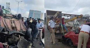 Hyderabad, October 26: A speeding car overturned on the JNTU flyover on Sunday morning, causing panic among commuters. The incident took place around 7:50 a.m. when the car, traveling from the Rythu Bazar junction, lost control while ascending the flyover. The vehicle first hit a road divider and then collided …
