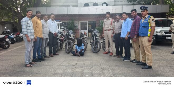 Hyderabad:Dec 01(PMI NEWS) In a major breakthrough, Afzalgunj Police arrested a serial bike theft offender, Kurva Naresh alias Potti Naresh (29), and recovered five stolen motorcycles from his possession. The arrest followed a complaint about the theft of a Hero Passion Plus from the Osmania General Hospital parking lot on 18 November 2025.