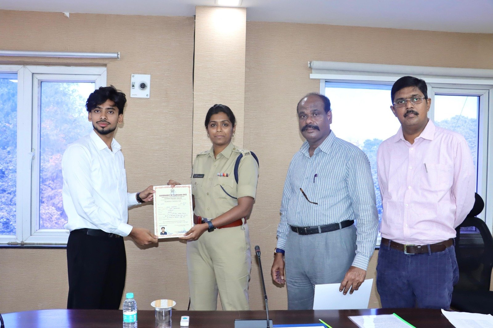 The certificate distribution ceremony was presided over by Smt. Rakshitha K. Murthy, IPS, Deputy Commissioner of Police, CAR Headquarters, Hyderabad, in the presence of Sri Shaik Jahangir, Additional Deputy Commissioner of Police, CSW, and Deputy Controller, Civil Defence Organization, and Sri K. Vijay Kumar, Assistant District Fire Officer.
