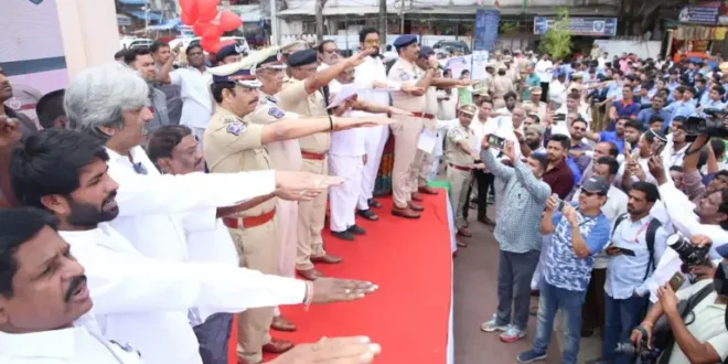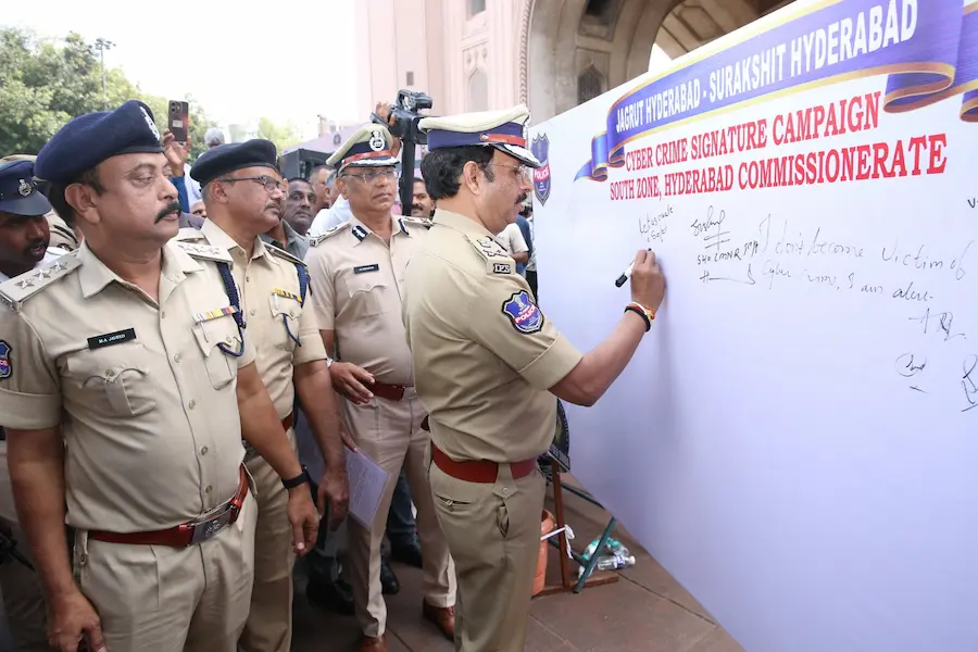Speaking at the ‘Jagrut Hyderabad – Surakshit Hyderabad’ awareness program held at Charminar, he distributed pamphlets on cybercrime prevention, flagged off a rally from Charminar to Madina, and administered the Cyber Pledge to participants.
