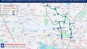 Hyderabad, 29 October(Shoukat-PMI) 2025: The Hyderabad Traffic Police has announced major traffic diversions in connection with the commencement of construction of the Elevated Corridor from Paradise Junction to Dairy Farm Road on NH-44, starting 30 October 2025. The construction is expected to last approximately nine months.