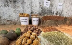 “We are using slaked lime as the base. It is soaked for a month and then mixed with the pulp of wood apples, black gram, natural gum found in India called gond jaggery and red brick dust,” Hussain says.
