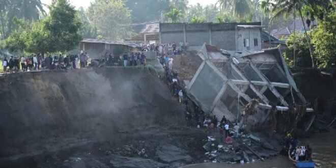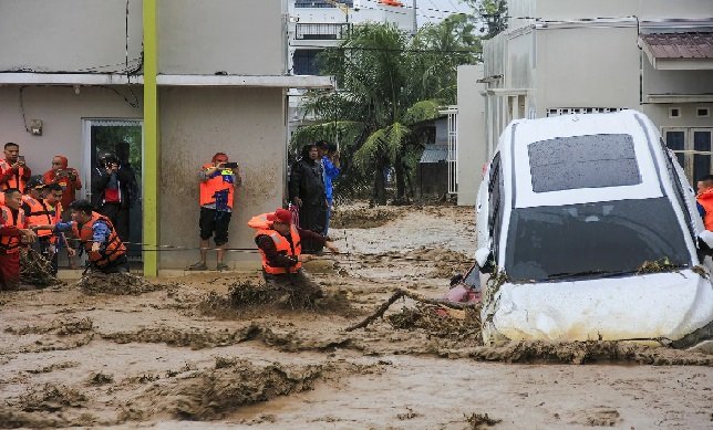 The heavy downpours caused rivers to burst their banks in Indonesia’s North Sumatra province, with the deluge tearing through mountainside villages, sweeping people away and submerging thousands of homes and buildings.