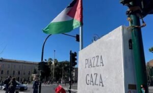 Outside Termini railway station a small tent camp has sprung up with a sign declaring its address as “Piazza Gaza”. Nearby, a giant minimalist statue of Pope John Paul II has been dressed in a Palestinian scarf.