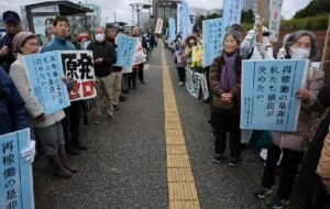 About 300 protesters rallied to oppose the vote, holding banners reading “No Nukes”, “We oppose the restart of Kashiwazaki-Kariwa” and “Support Fukushima”.