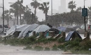 “It might keep raining for a week, so where will I go? I will stay here, what else can I do? I have no shelter except here, under this tree,” Marie said, his clothes soaked through.