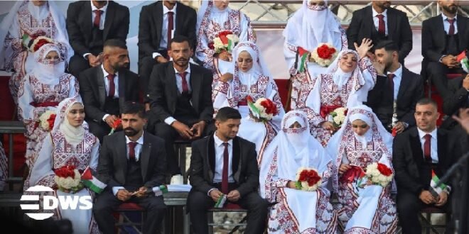 KHAN YOUNIS: Eman Hassan Lawwa was dressed in traditional Palestinian prints and Hikmat Lawwa wore a suit as they walked hand-in-hand past the crumbled buildings of southern Gaza in a line of other couples dressed in exactly the same way.