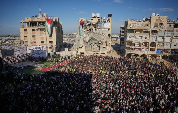 As roaring crowds waved Palestinian flags in the southern city of Khan Younis, the celebrations were dampened by the ongoing crisis across Gaza. Most of Gaza’s 2 million residents, including Eman and Hikmat Lawwa, have been displaced by the war, entire areas of cities have been flattened and aid shortages and outbursts in conflict continue to plague the daily lives of people.