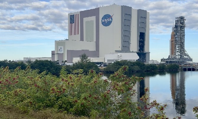 Over almost 12 hours, the 98m-tall Space Launch System was carried vertically from the Vehicle Assembly Building on the 4-mile (6.5km) journey to the pad.