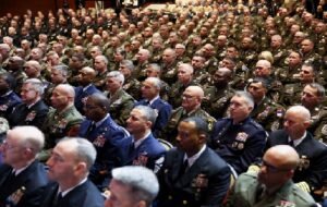 The auditorium was filled with senior uniformed officials, seated in front of a stage with a large American flag, a lectern and boards that read; “Strength. Service. America.”