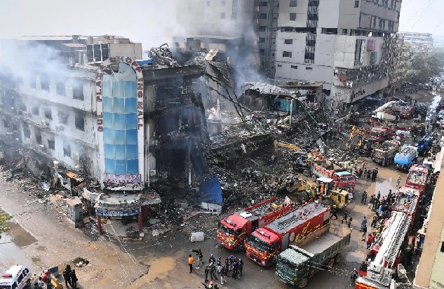 By Sunday evening, various parts of the Gul Plaza were charred and reduced to rubble. Rescuers told media that the whole building could come down.