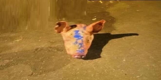 In the video, a man wearing a sweatshirt can be seen placing a pig’s head to the left of the mosque’s entrance before taking a picture of his suspected crime.