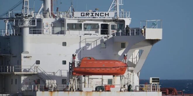 The Grinch, which was sailing under a Comoros flag, left the Russian Arctic port of Murmansk in early January and is suspected of operating under a false flag and of belonging to the secretive fleet of ships that enables Russia to export oil around the world despite international sanctions due to Moscow’s war on Ukraine.