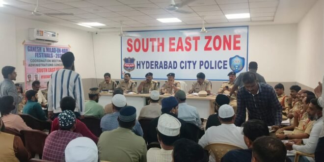 Hyderabad, Sept. 12(Najaf Ali Shoukat-PMI)The South East Zone police on Friday held a coordination meeting with organizers of Milad-un-Nabi rallies scheduled for September 14, 2025. The meeting was chaired by DCP South East Zone Sri Chaitanya Kumar IPS, along with Addl. DCP K. Srikanth, ACPs, and SHOs of the zone.