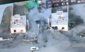 Footage of the aftermath showed plumes of smoke rising from a charred vehicle behind a security barrier. The incident occurred at 12:39 local time (07:39 GMT).