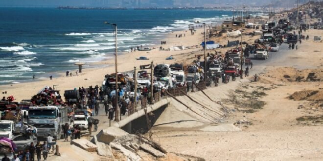 Until now, they have been forced to flee down the main coastal road to an Israel-designated “humanitarian area” in al-Mawasi but on Wednesday, the Israel Defense Forces (IDF) announced that it would open temporarily a second route for people to travel on, the central Salah al-Din road. It said the route would be open for 48 hours from 12:00 local time.