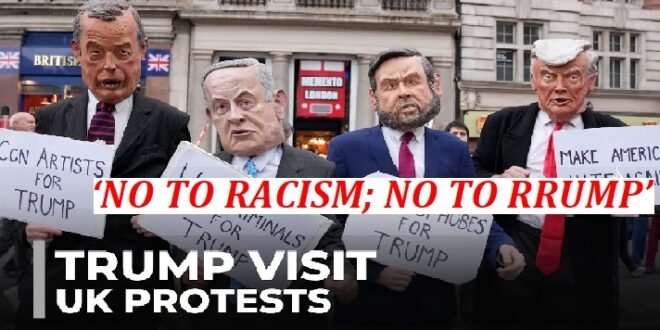 Hundreds of protesters gathered at Portland Place in central London, near the BBC’s Broadcasting House, carrying banners reading “No to racism, no to Trump,” alongside smaller versions of the “Trump baby blimp” that became an icon of mass demonstrations against his first state visit in 2019. The protesters were also marching towards Whitehall and Parliament Square.