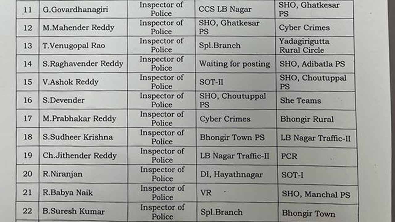 Hyderabad”27 Jan 2024 (PMI) A large number of inspectors have been transferred in Rachakonda Commissionerate, which is one of the Tri Commissionerates of Hyderabad. CP Sudheer Babu issued orders transferring 25 inspectors and six SIs at once. G.Venkateshwarlu has been appointed as Chaitanyapuri PS SHO who has been in the news for some time now. G. Srinivas Reddy, who was Bommalaramaram S, was transferred to Chaitanyapuri PS. Similarly, Hayatnagar SHO Venkateswarlu was transferred to Maheswaram Police Station.(pressmediaofindia)